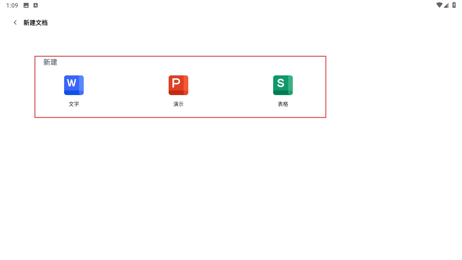 在【新建文档】页面,你可以根据自己的需求,选择【文字】【演示】【表格】这几个选项,来创建对应的文件类型。