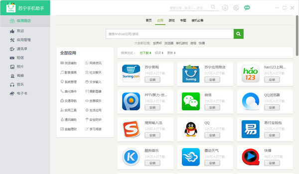 苏宁手机助手是官方推出的一款集软件、游戏、电子书、视频于一身的资源中心,可以很方便的对手机中的通讯录、图片等进行管理,还支持软件一键安装到手机等功能。