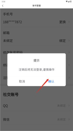 3、点击【注销账号】选项,在弹出的窗口中点击【确定】选项即可。