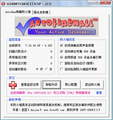 AutoRun病毒防火墙 V7.01 简体中文绿色免费版 一款防御AutoRun病毒的小工具,可以非常方便的让您的电脑处于监控AutoRun病毒之中。防火墙会实时拦截插入的USB设备,对其进行检测,如果发现有病毒,则会进行简易查杀,进而自动弹出USB设备,再次插入USB设备即可正常使用。防火墙最大程度的降低了插入外来USB设备时染毒的几率,使用便捷