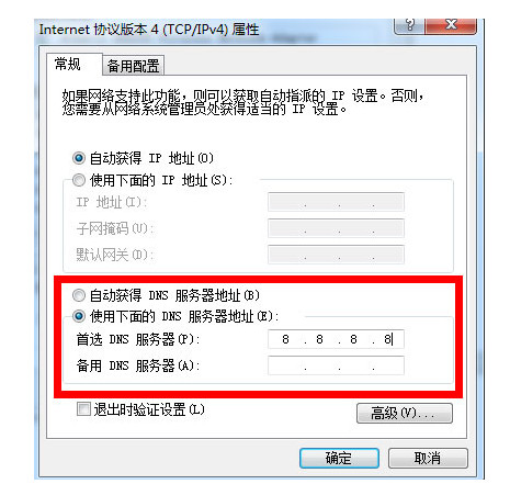 7、将使用下面的DNS服务地址中的的“首选DNS服务器地址”修改为8.8.8.8,点击确定即可正常更新或链接网易电竞平台。