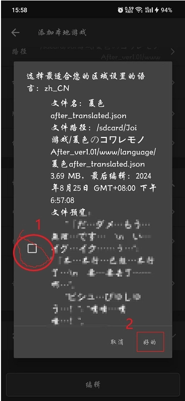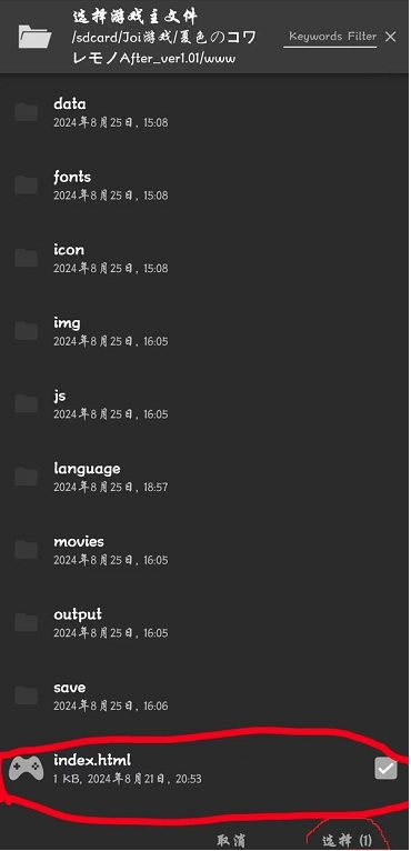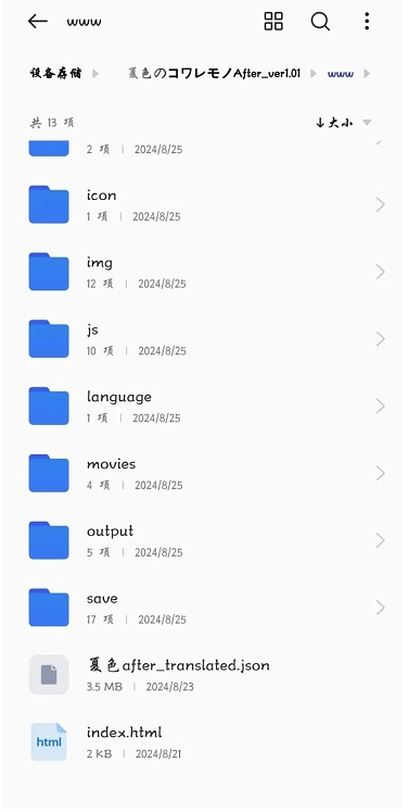3.游戏添加完成后其实就能直接启动,但此时还没添加翻译文件,所以启动后也不会有汉化效果。若要加载翻译文件,首先得打开文件管理器(手机自带的或其他第三方的都可以)。找到游戏对应的文件夹,然后在里面查找后缀为JSON的文件。(比如《夏色泡影》我直接建了个专门放翻译文件的文件夹,但并非所有游戏都会预设这样的文件夹,这种情况下就需要自己在游戏文件夹里仔细找后缀是JSON的文件。)