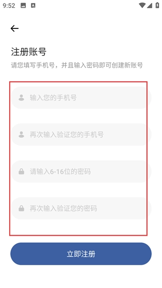 4、进入【注册账号】页面后,要按顺序填写手机号、设置6至16位的密码,填写完毕后点击【立即注册】按钮,就能完成账号注册操作。