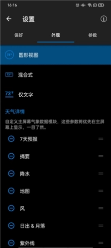7、自定义布局。您可以在界面排布设置里选择想要显示的天气参数。