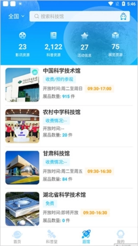 3、在逛馆模块,用户可以访问全国各地的科技馆。