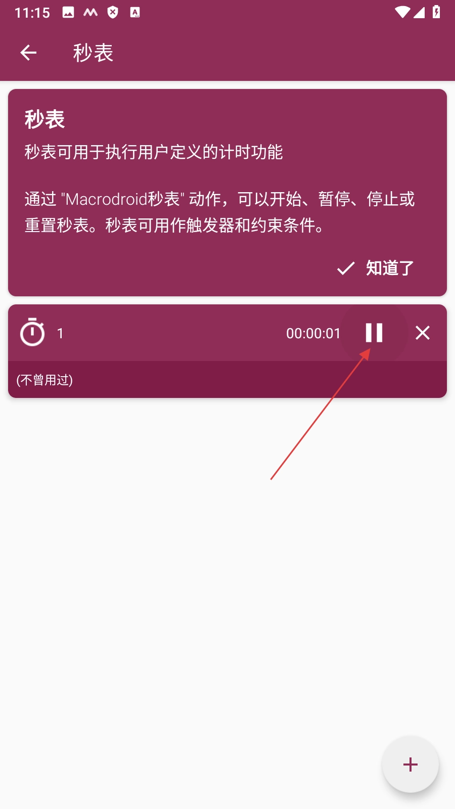 新秒表创建完成后,点击【暂停按钮】就能开始使用秒表了。
