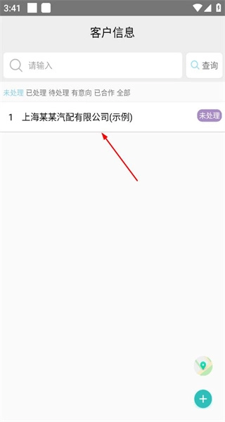 2、进入客户信息列表页面,看到客户条目,点击上海某汽配公司条目,进入该客户的详情信息页面。