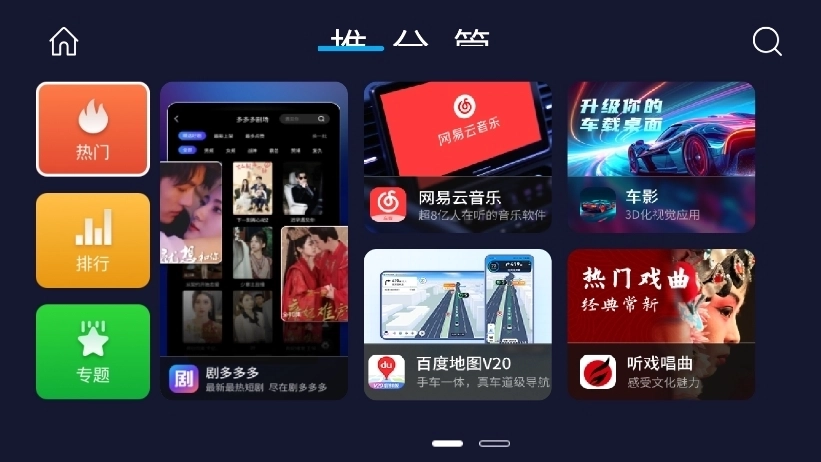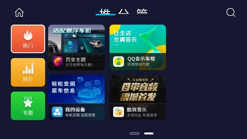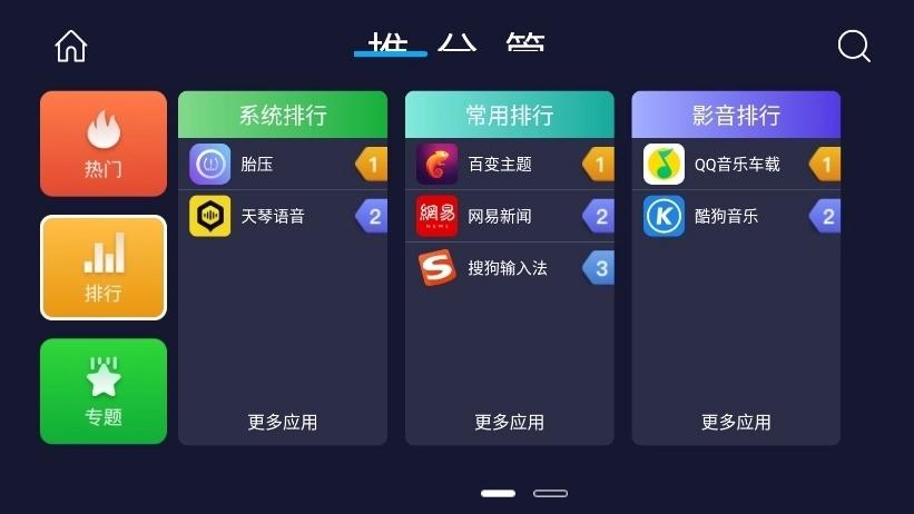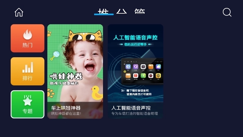 专题页面:点击导航栏中的“专题”按钮,即可进入专题页面。该页面汇聚了各类同类型应用,像“车上哄娃神器”“人工智能语音声控”等,能为用户带来更丰富的选择。
