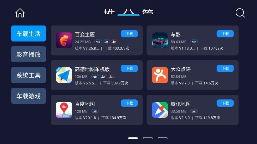 分类页面:点击导航栏上的“分类”按钮,即可进入分类页面。该页面依据系统工具、影音播放、车载经典等不同类别对应用进行划分,用户能够按照类别来浏览各类应用。