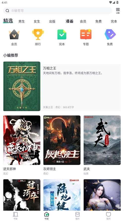 2、书城是各类小说与漫画资源的汇集地,在这里你可以找到任何你想阅读的内容。