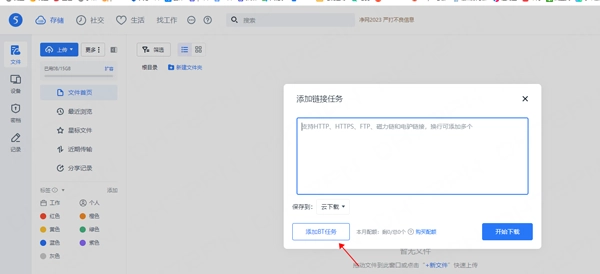 2. 登录后进入【云】→【文件】→ 点击【上传】下拉菜单 → 选择【链接任务】→ 点击【添加bt任务】