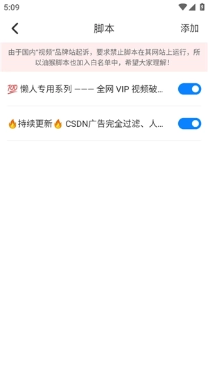 4、在这里可以看到已经安装了的脚本,点击右侧的按钮控制脚本的开关。