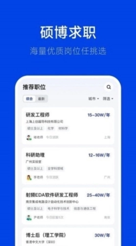 1、个性化求职服务:专为硕博人才打造,精准匹配多元求职需求,通过定制化筛选工具,助力快速锁定心仪岗位。