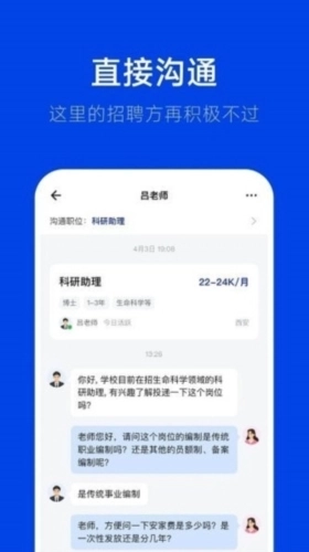2、直接沟通,这里的招聘方十分积极,让你轻松在线完成求职招聘操作。
