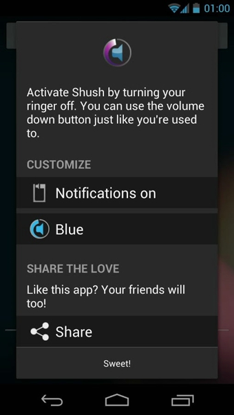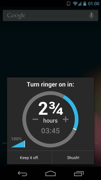 Shush Ringer Restorer v12.7 安卓版 当你把手机调至静音状态,音量调节器即会被启用。无需开启特定的应用程序,当你把手机设置到震动或无声状态时,本应用程式将会询问你静音状态要持续多久时间。从此不会再因为忘记把铃声恢复而错过重要来电!
