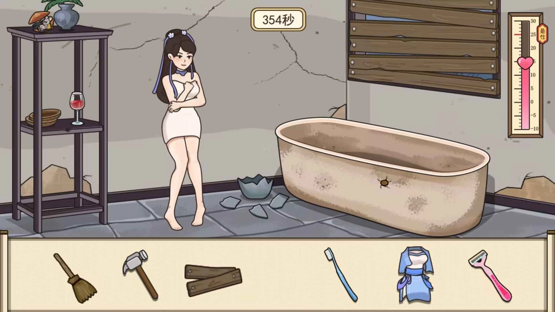 1、用物品栏中的【木材】分别将破窗户和墙窟窿堵住,此时室内温度+10°C。