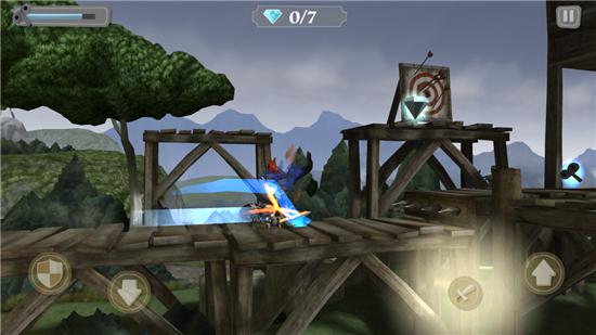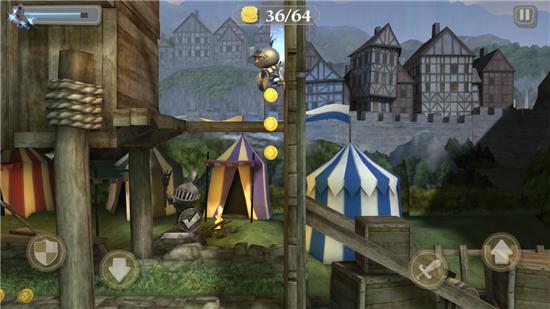 使用左手可以命令骑士小哥做出盾牌格挡和滚地两种动作,右手就更简单了,分别控制攻击和跳跃,玩家需要利用这四种行动来闯关。沿途你会遇到各种奇奇怪怪但是又非常有意思的障碍或陷阱,比如豌豆投石机、阁楼中下落的木桶都可以将你砸死,不用考虑了,立刻举起你的盾牌吧。“滚地”其实就是为了通过一些比较低矮的环境,玩法要领从本质来说和《神庙逃亡》系列是一致的,只是角度和操作上《发条骑士》系列更有新鲜感。