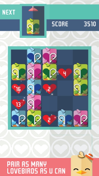 当其他的鸟儿在水管间疾飞时,爱情鸟却还在原地握着只有一半的心等待着爱的来临。爱情鸟有双翅膀,可是在遇见它的另一半之前它都学不会飞翔。滑动你的手指指挥爱情鸟们移动,只有墙壁可以让它们停下来。爱情鸟在遇到它的真爱后,会留下一颗红心。红心相撞之后便会升级,级别越高,所得到的分数也就越高。你可以选择牺牲一级红心来帮助它周围的鸟儿改变手中心的形状。