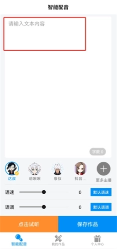 指尖配音是一款由合肥比派网络科技有限公司所研发的配音录制软件。为用户带来智能化的配音服务,输入文案就能进行语音的转换,并发出不同具有特色的声音,完善你的作品,赋予作品的灵魂。用户可以在软件中挑选自己喜欢的类型进行实时使用,帮助用户轻松制作出精美的音频内容,让用户轻松完成不同的配音服务。还具有十分丰富的配音神作,用户可以跟着学习。
