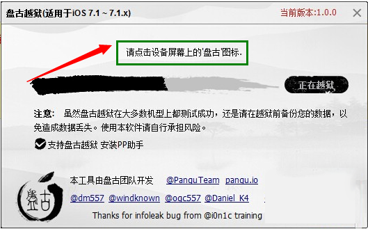 然后点击苹果设备中的“盘古”图标以继续越狱操作。