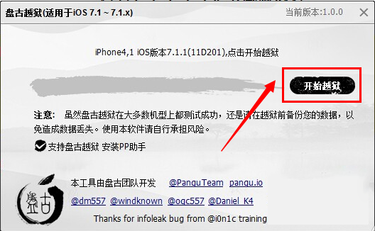 盘古”一键越狱iOS7.1.x的具体方法:将苹果手机与电脑相连,接着运行“盘古”越狱工具,点击程序界面中的“开始越狱”按钮。
