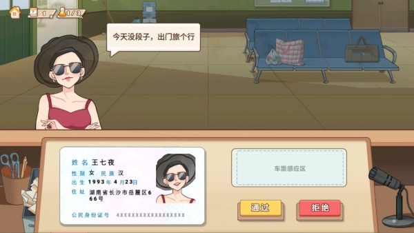 3.如下图所示,在检票高手模式下,玩家需对旅客身份进行核验,再决定是否予以放行。一旦判断失误,便会导致游戏失败。