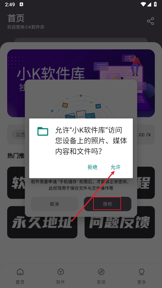 请先在本站完成软件安装,打开软件后找到并点击“授权”选项,随后允许软件获取相关权限以进行访问操作。