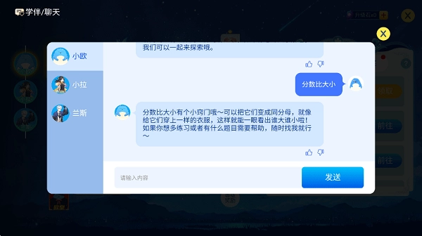 平台为用户配备了小欧、小拉与兰斯这三位AI玩伴,点击“聊天答疑”按钮就能进入聊天页面。