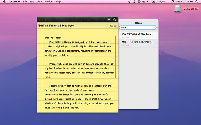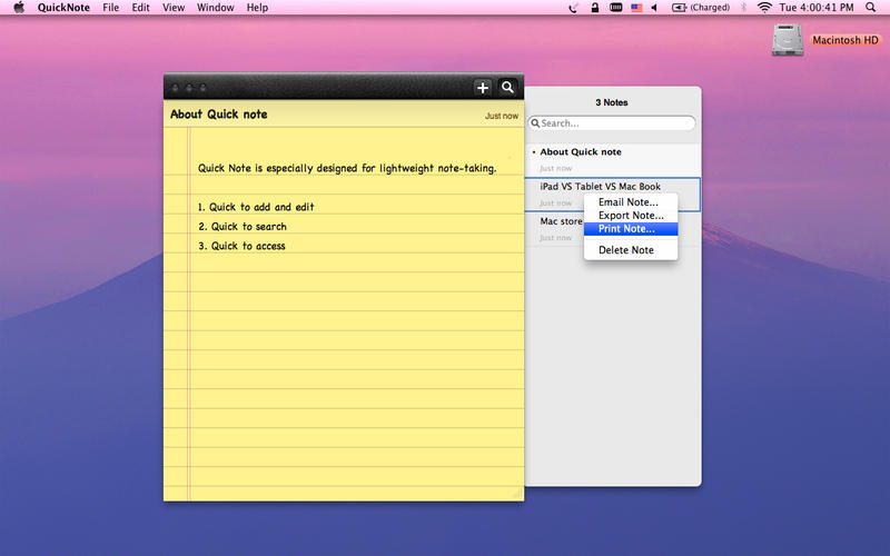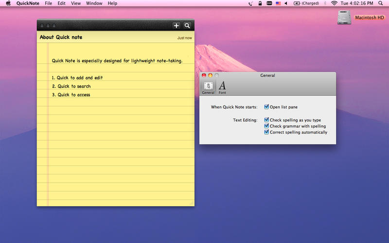 QuickNote是一款专为苹果mac用户提供的mac笔记软件,用户可以将自己的工作安排、日常活动、课堂笔记等信息快速的记录在QuickNote里,并且会以桌面便签的形式存在,时刻提醒用户不要忘记。
