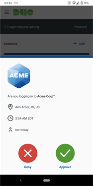 当屏幕上弹出Duo Push通知时,轻点提示的区域就能看到可执行的操作选项:批准或者拒绝。