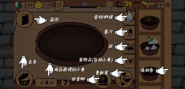 6、最后一步是近视装盘并递给客人,右侧可选择装饰品,点击“F”上菜,客人会打分并支付相应费用,评分越高,收益越多