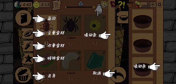 3、点击桌上的食材框,左侧可选择主要食材、次要食材和特殊食材,先在主要食材里找到蟑螂并点击3次,接着在次要食材中找到洋葱,点击将其放入右侧的碗具内。