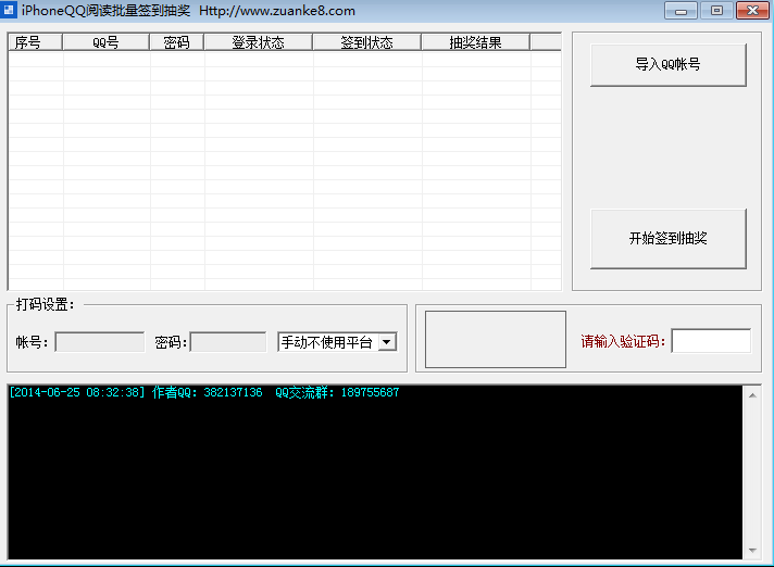 1、导入QQ号码,格式:qq号码----QQ密码,一行一个。2、开启签到,打码即可。
