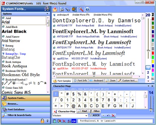 这款字体浏览应用软件让你可以在已经安装在你的系统中的字体或者从硬盘驱动器上安装的带有样本、预览、立体浏览、文本编辑、打印预览以及用于选择字体的Windows操作系统字符映射表的临时安装字体中进行导航