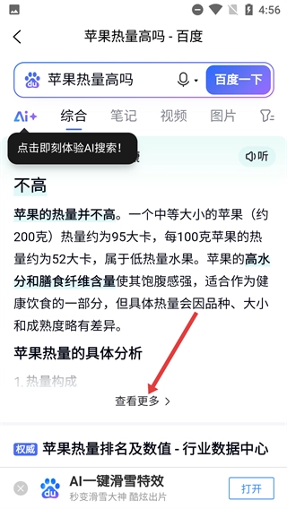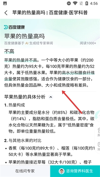 4、进入详细页面后,能够查看关于苹果热量的具体分析内容,知晓其热量情况等相关信息。