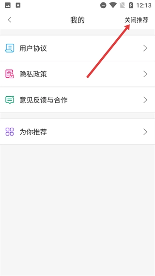 3、在【我的】页面中,能够查看【用户协议】【隐私政策】等内容,点击右上角的【关闭推荐】按钮,就可以关闭相关的推荐内容。
