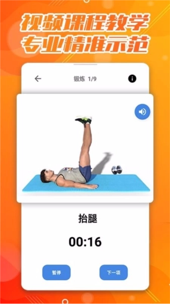 3、能够自动通过视频演示锻炼动作,还可以手动进行关闭语音、暂停、切换至下一项等操作;