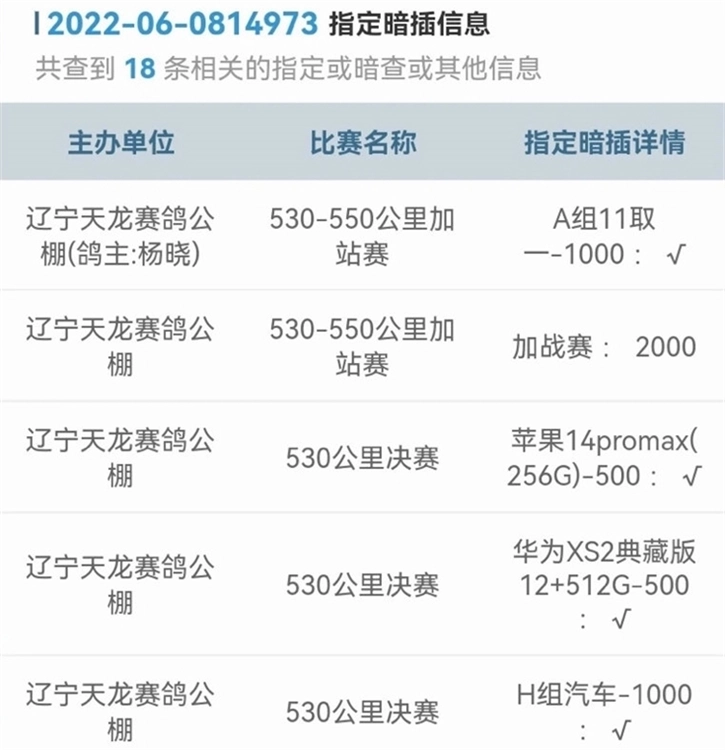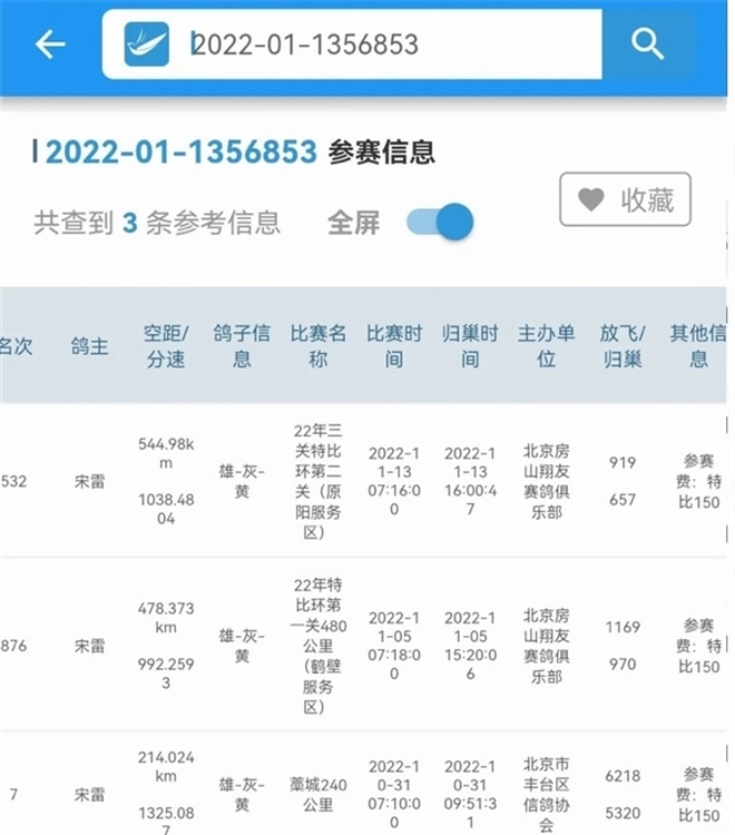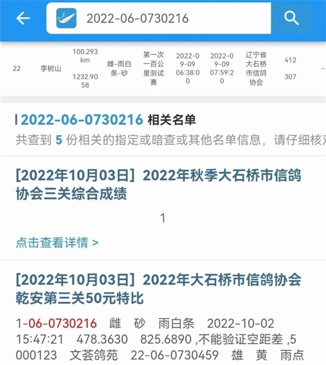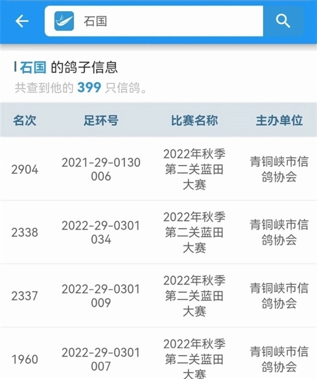 当用户输入完整的足环编号后,系统会自动对该赛鸽的参赛过往进行匹配,并呈现出涵盖比赛名称、司放地点、归巢时刻、排名、分速、飞行里程等在内的12项关键信息。
