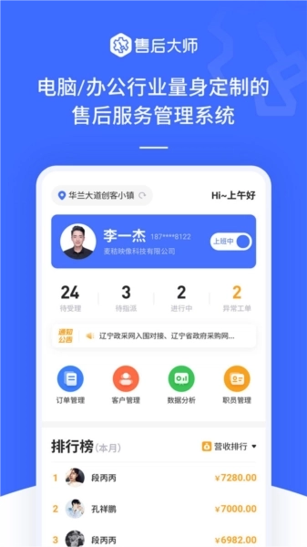 售后大师是一款简洁易用的售后管理云平台软件,专注于实现售后服务的精益化管理,旨在提升客户服务体验并降低售后服务成本。用户借助该软件,可使用扫码报修、工单管理、智能派单、备件申领、设备管理、产品管理、通知公告等功能,不仅能更高效地接收和管理工单,还能对客户、绩效等进行管理,从而快速提升办公效率。