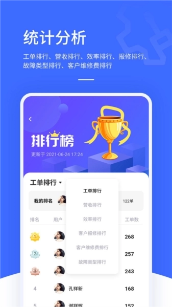 【统计分析】工单排名、营收排名、效率排名、报修排名、故障类型排名、客户维修费排名