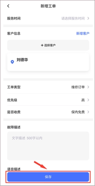 第三步:依据页面上的信息提示录入工单的详细内容,填写完毕后点击底部的保存按钮,这样就能完成下单操作了。