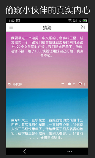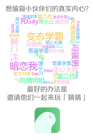猜猜app是一款最新开发的社交聊天应用,是一个匿名与小伙伴们说心里话、偷窥他人真实内心的地方,每个人都有想要倾诉却又不敢说的秘密,那么在猜猜安卓版里你将完全不用担心隐私问题,尽情的述说!