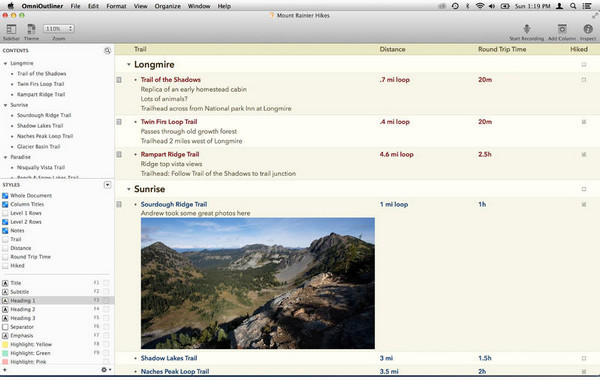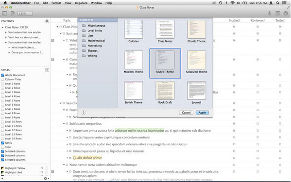你可以使用OmniOutliner的文档结构功能建立一个由主标题跟下级观点构成的可扩展或者折叠的多级别、多层次的文件构架。这一点极其有用,特别是当你产生任何新的观念、钻研观点的各个细节,还有排列完成一件事所需要的步骤。OmniOutliner对你所要列出的纲要数量没有任何限制!你可以设置复合,多重的专栏或者段落,而且还有非常聪明的提醒功能。
