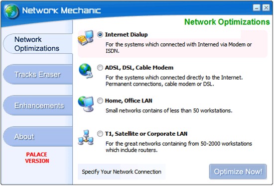 不论你是采用何种网络连接方式,Network Mechanic 都可以帮助你优化本地网络环境,加快网络连接,浏览和下载速度,采用对TCP/IP 网络连接协议优化的方式来提高本地网络连接速度,并具有清除网络浏览产生的垃圾/临时文件的作用!程序采用精灵向导的操作节目,非常容易使用!