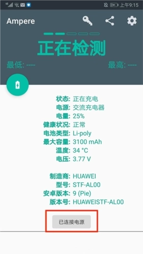 3、接着我们接通电源,可看到当前的电源类型、充电w数、电量、电池的最低和最高容量等参数,