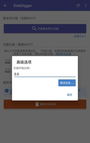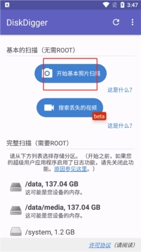 1、打开磁盘挖掘机diskdigger的主页面,点击启动基础照片扫描功能;