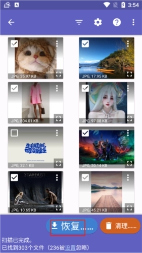 2、系统将自动扫描您手机里能够恢复的图片文件,请勾选您需要恢复的图片,然后点击恢复按钮即可。