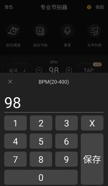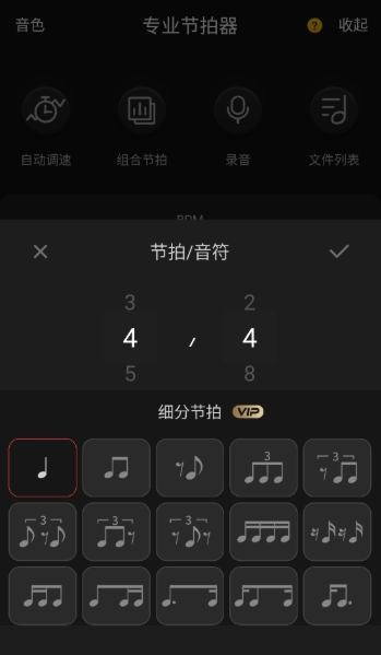 节拍设置与速度调节:可对BPM(速度)和节拍类型(例如4/4、3/4等)进行设置,还能自定义细分节拍(包含重音、次重音、轻音、空音),同时支持自动调速或手动调速两种模式。