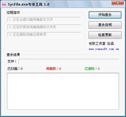 3、单击“开始查杀”按钮进行查杀,专杀工具将自动进行病毒清理、文件夹恢复和注册表清理三个步骤。