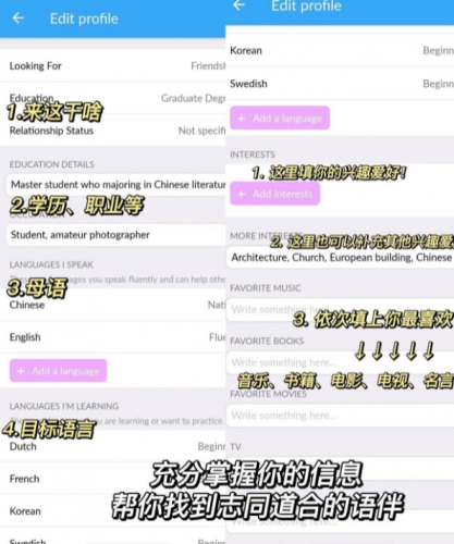 外国用户的基数挺大的,我浏览了不少人,感觉真诚的用户很多,大部分人都填写了很长的个人信息。(所以建议大家多补充些兴趣爱好之类的内容,让别人能更好地了解你)